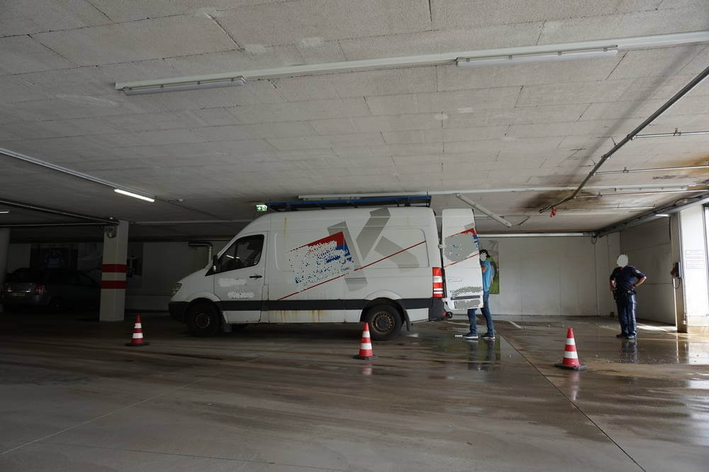 In der Tiefgarage fuhr ein zu hohes Fahrzeug einen Sprinkler ab, dies löste den Brandmeldealarm aus.