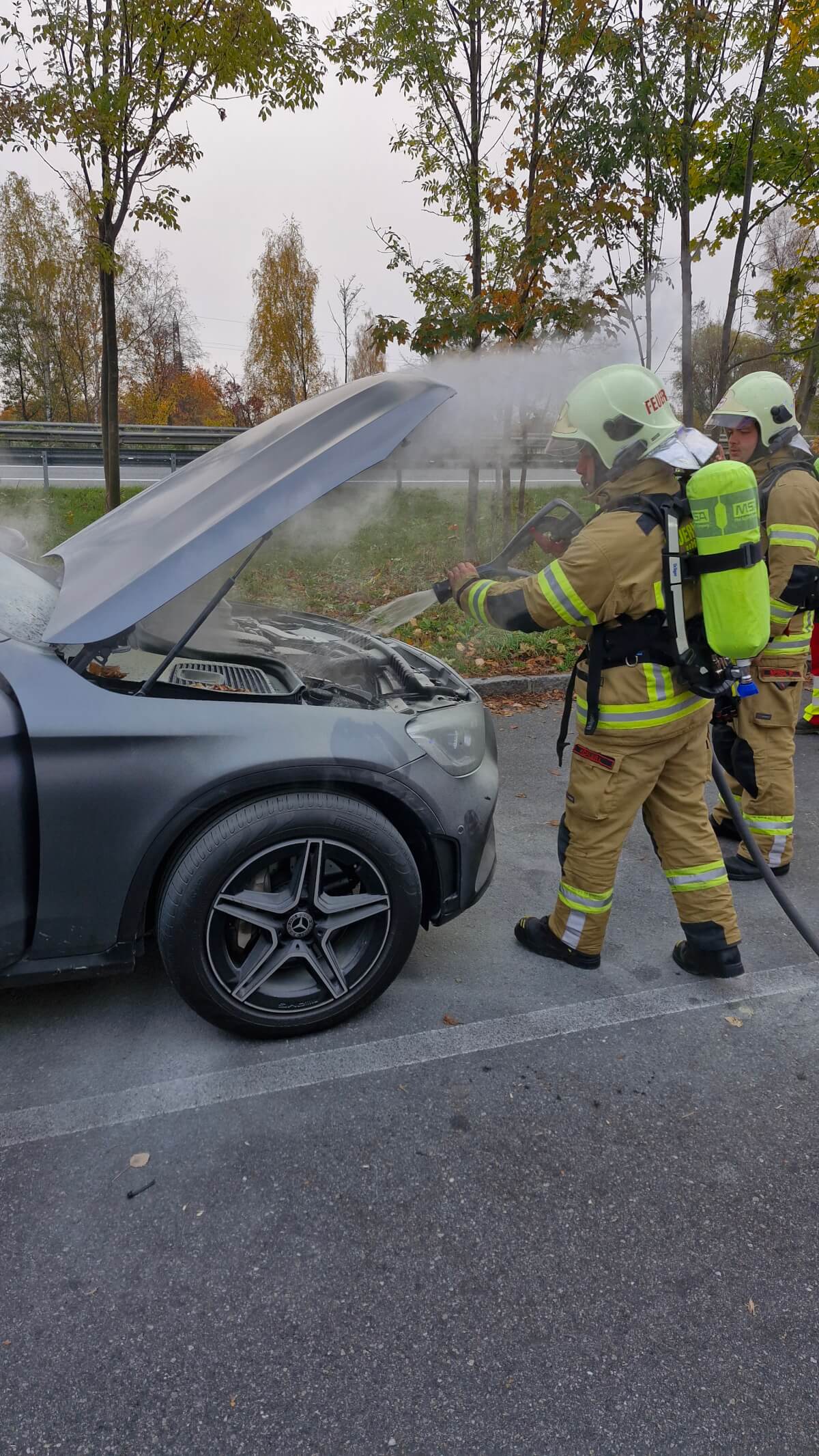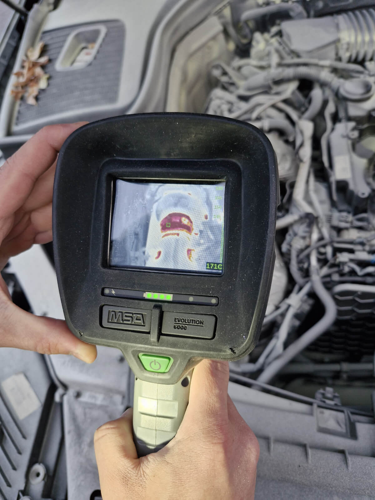Wir kontrollierten das gesamte Fahrzeug mittels Wärmebildkamera und kühlten den Motorraum mit unserem HD-Schlauch ab, um eine erneute Brandentwicklung zu verhindern.