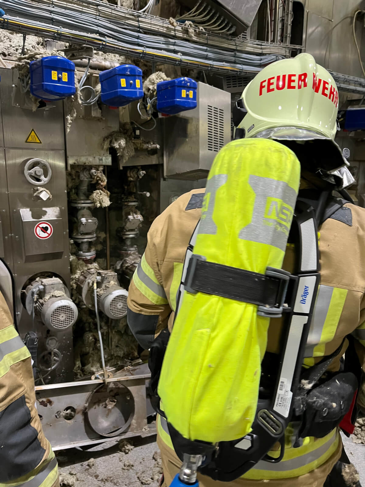 Im Rahmen des Brandmeldealarmes beim Altersheim wurde die Feuerwehr Völs telefonisch verständigt, dass es im Bereich eines Produktionsbetriebes in Völs aufgrund von Schweißarbeiten zu einer Glimmbrandentwicklung gekommen ist. Somit handelte es sich um einen Folgeeinsatz ohne Zusatzalarmierung. Bei Eintreffen des Einsatzleiters konnte nach Erkundung mit den Technikern vor Ort festgestellt werden, dass es bei einem Thermoölofen hinter diversen Verkleidungen zu einer Glimmbrandentwicklung gekommen ist. Die Aufgabe der Feuerwehr bestand darin, in Zusammenarbeit mit den Technikern die Verkleidungen zu demontieren und die glimmende Dämmwolle zu entfernen. Diese Arbeiten wurden von der Feuerwehr Völs mittels schweren Atemschutz unter Anwendung von Schanzwerkzeug und des Speziallöschmittels F500 durchgeführt. Nach Kontrolle mit der Wärmebildkamera und Durchnässung des restlichen Dämmmaterials konnte der Einsatz für die Feuerwehr Völs beendet werden und dem Betreiber unter Anweisung des Erfordernisses einer Brandsicherheitswache und laufenden Kontrolle übergeben werden.