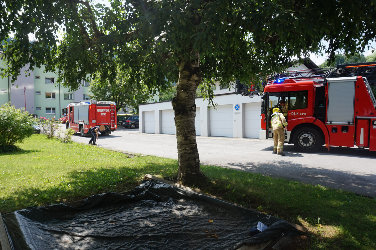 Zugleich wurde die Drehleiter in Stellung gebracht, um eine mögliche anschließende schonende Bergung des Patienten aus dem zweiten Stock zu ermöglichen. Trotz der sehr engen Platzverhältnisse aufgrund der parkenden Fahrzeuge und der Bäume konnte die neue Drehleiter problemlos aufgestellt werden. Die Wohnung wurde schlussendlich durch das Fenster mittels der Schiebeleiter betreten und die Wohnungstüre von innen geöffnet, um den Rettungsdienst den Zugang in die Wohnung zu verschaffen.