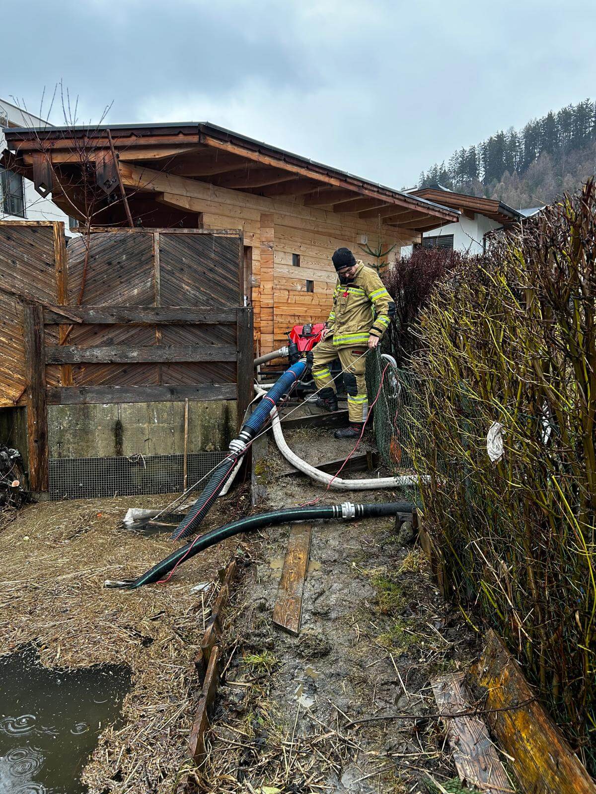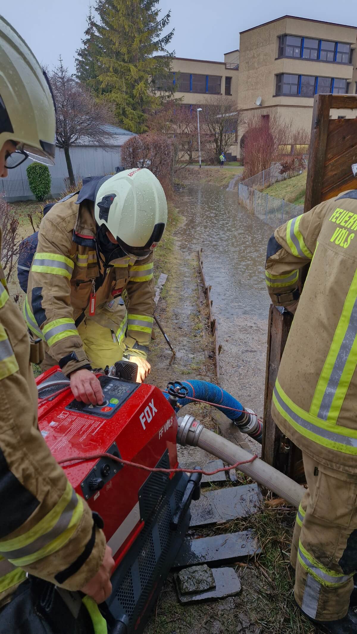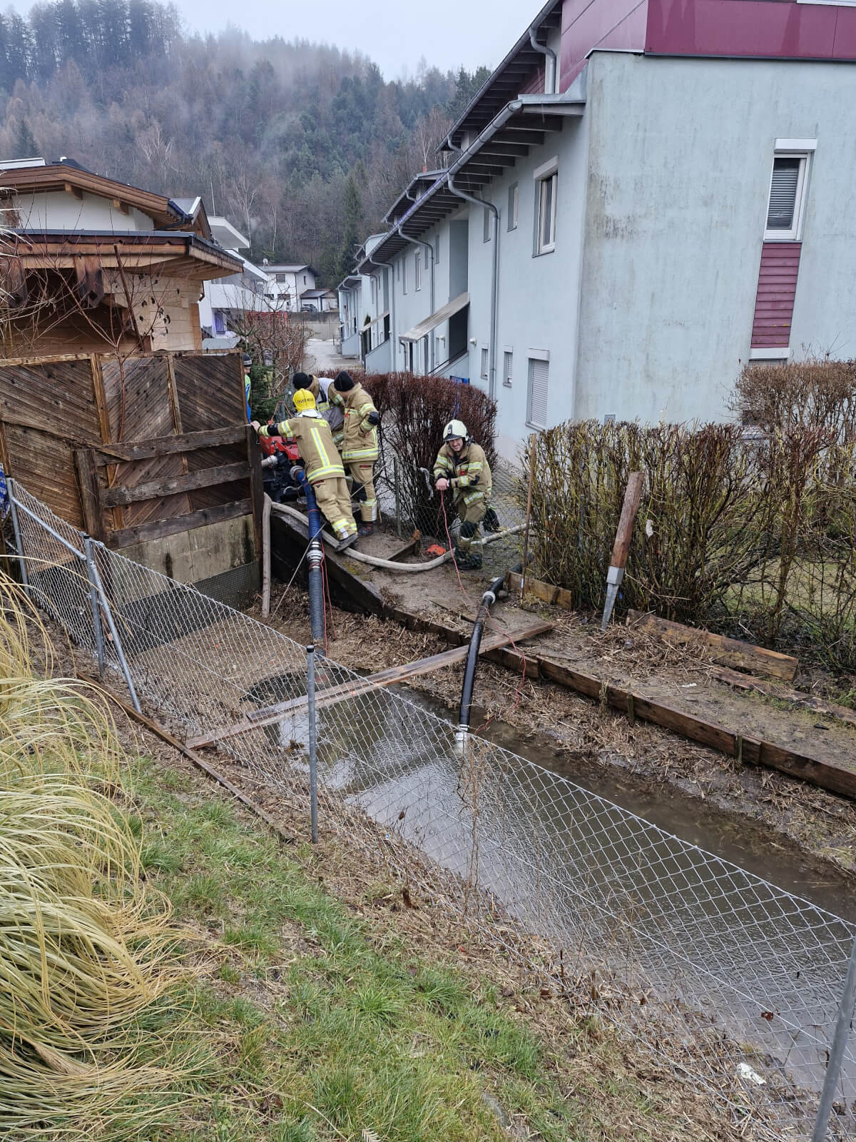 Um ein Überlaufen zu verhindern, das eine Gefahr für die angrenzenden Häuser dargestellt hätte, haben wir mithilfe einer Tragkraftspritze, einer Schmutzwasserpumpe und einer Tauchpumpe dem hohen Wasserspiegel entgegengewirkt und den Großteil des Wassers entfernt.