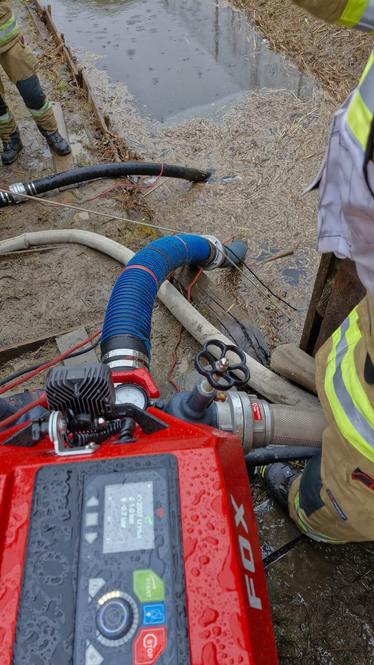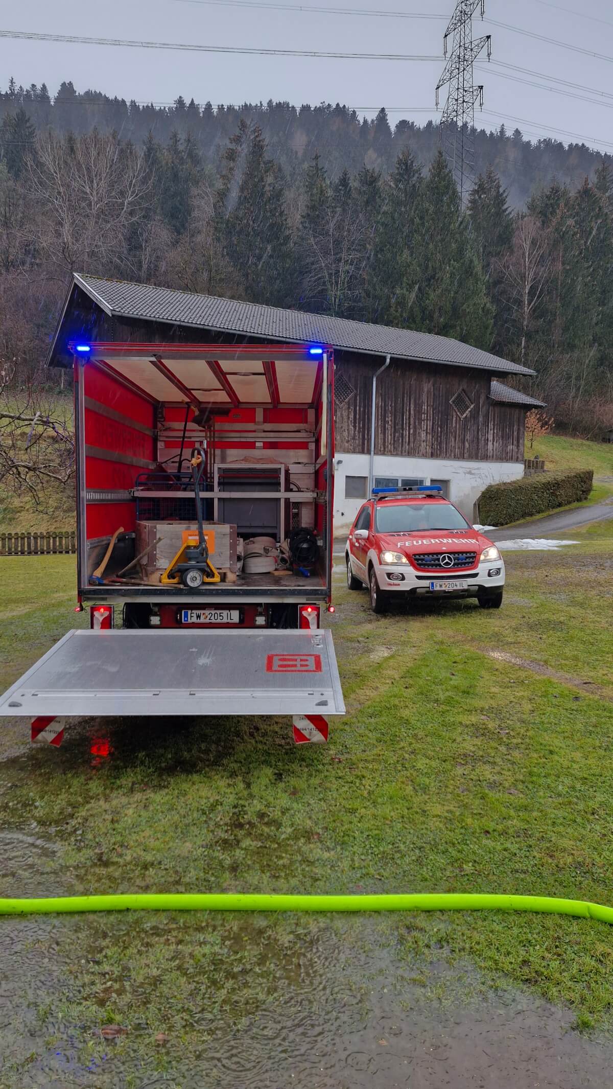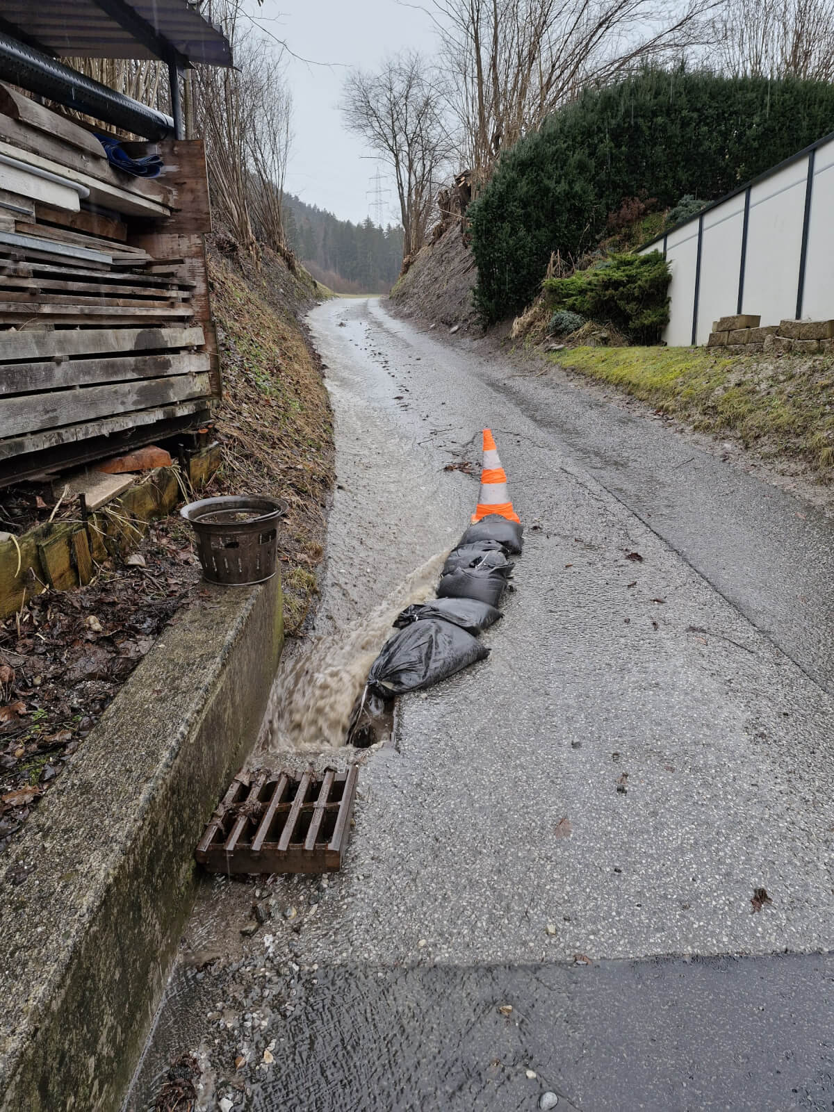 Um ein Überlaufen zu verhindern, das eine Gefahr für die angrenzenden Häuser dargestellt hätte, haben wir mithilfe einer Tragkraftspritze, einer Schmutzwasserpumpe und einer Tauchpumpe dem hohen Wasserspiegel entgegengewirkt und den Großteil des Wassers entfernt.