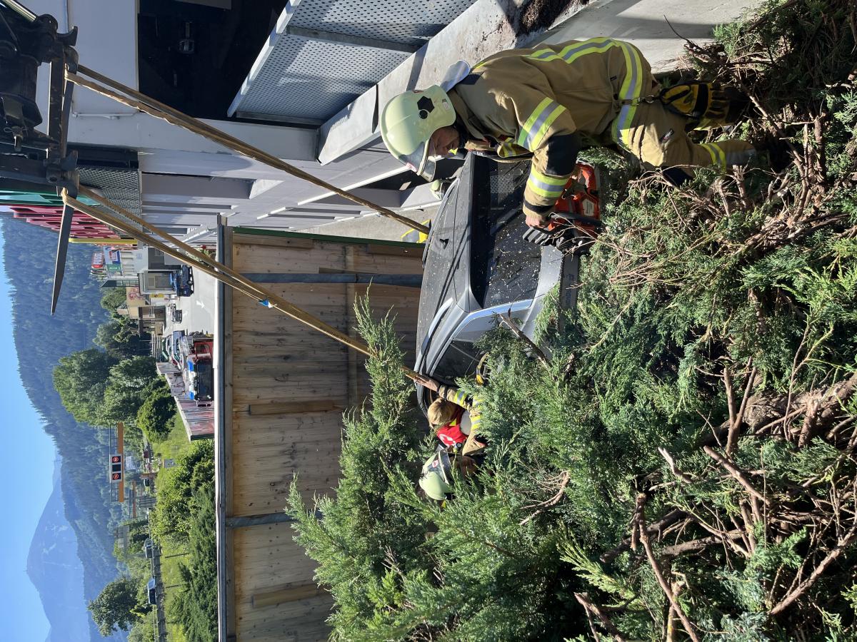 Am Dienstagnachmittag wurde die Feuerwehr Völs zu einem Verkehrsunfall am Gelände des Einkaufszentrums Cyta gerufen. Bei Eintreffen wurde festgestellt, dass ein PKW über steiles Gelände beim Abfahren von einer Parkdeckrampe abgestürzt war und sich eine Person noch im Fahrzeug befunden hat. Die Erstmaßnahmen waren die Fahrzeugstabilisierung und Patientenbetreuung in Form eines inneren Retters. In Zusammenarbeit mit der Rettung und dem Notarzt wurde die Person aus dem verunfallten Fahrzeug mittels KED-System (Rettungskorsett zur Stabilisierung der Wirbelsäule) und Spineboard gerettet. Weitere Maßnahmen waren die Absicherung der Unfallstelle und Beihilfe beim Abtransport des Fahrzeuges.