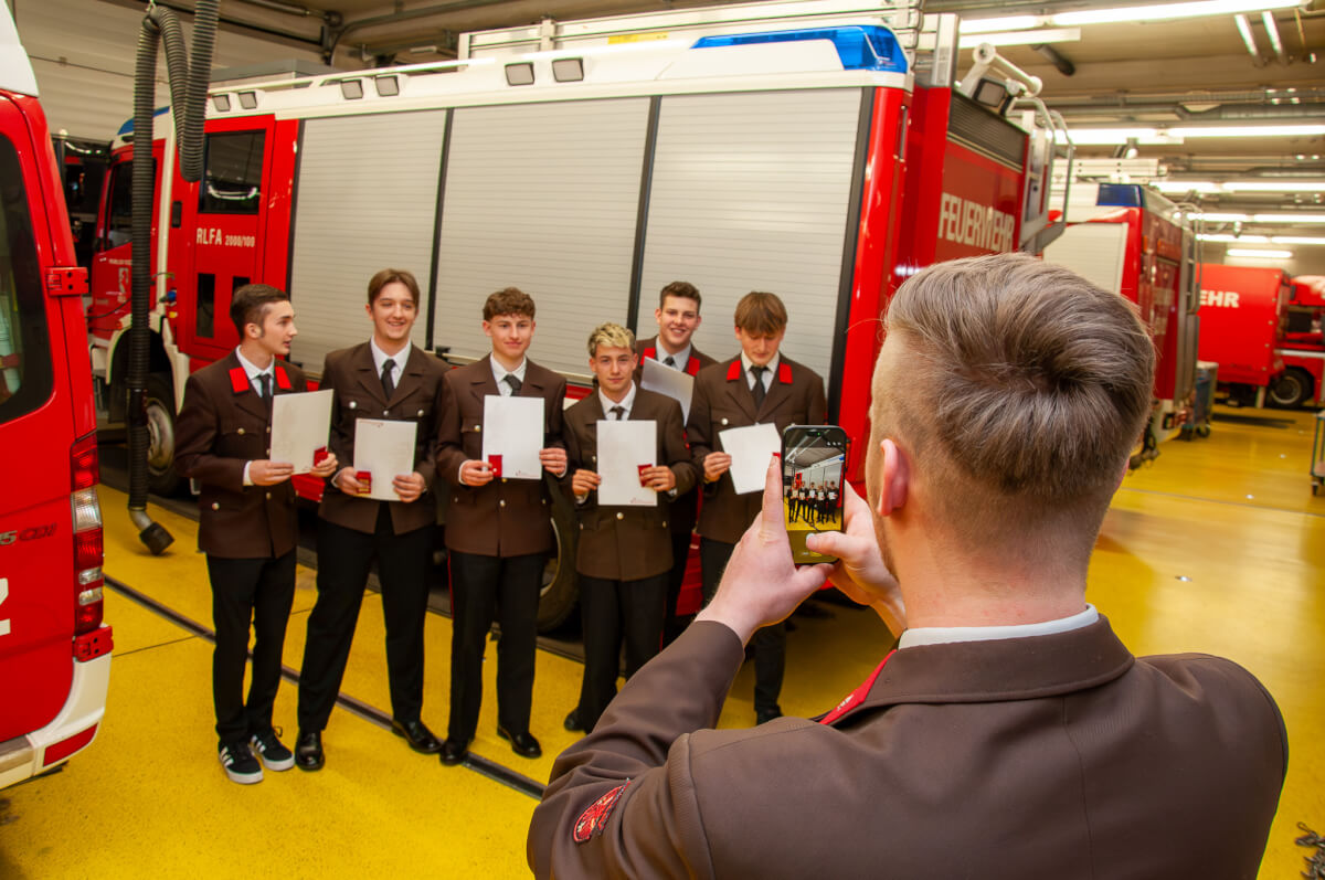Werden vom Kommandanten zum Oberfeuerwehrmann befördert.