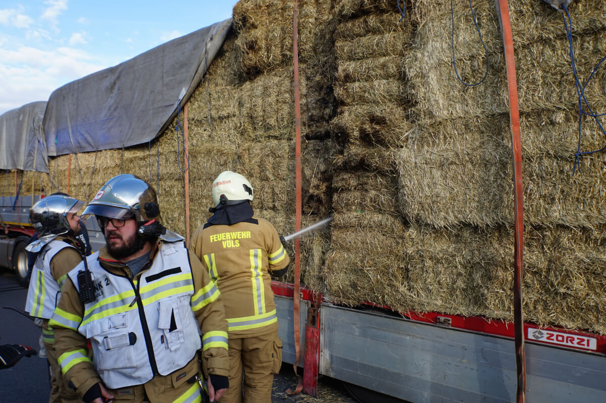 Am Dienstagabend wurde die Feuerwehr zu einem vermeintlichen LKW Brand auf der Autobahn alarmiert. Beim Eintreffen der Einsatzkräfte wurde der kleine Brand bereits vom Fahrer des LKW's mittels einem Pulverlöscher abgelöscht. Aufgabe der Feuerwehr bestand darin, die Ladung mit der Wärmebildkamera auf verbleibende Glutnester zu kontrollieren und diese zu beseitigen. Auslösegrund ist vermutlich eine von einem Auto herausgeworfene Zigarette, die sich im Heu verfing.