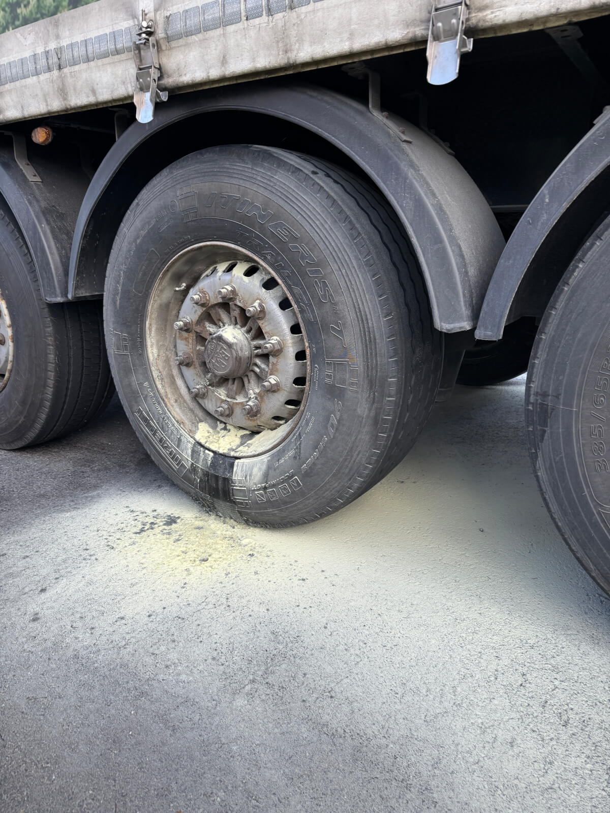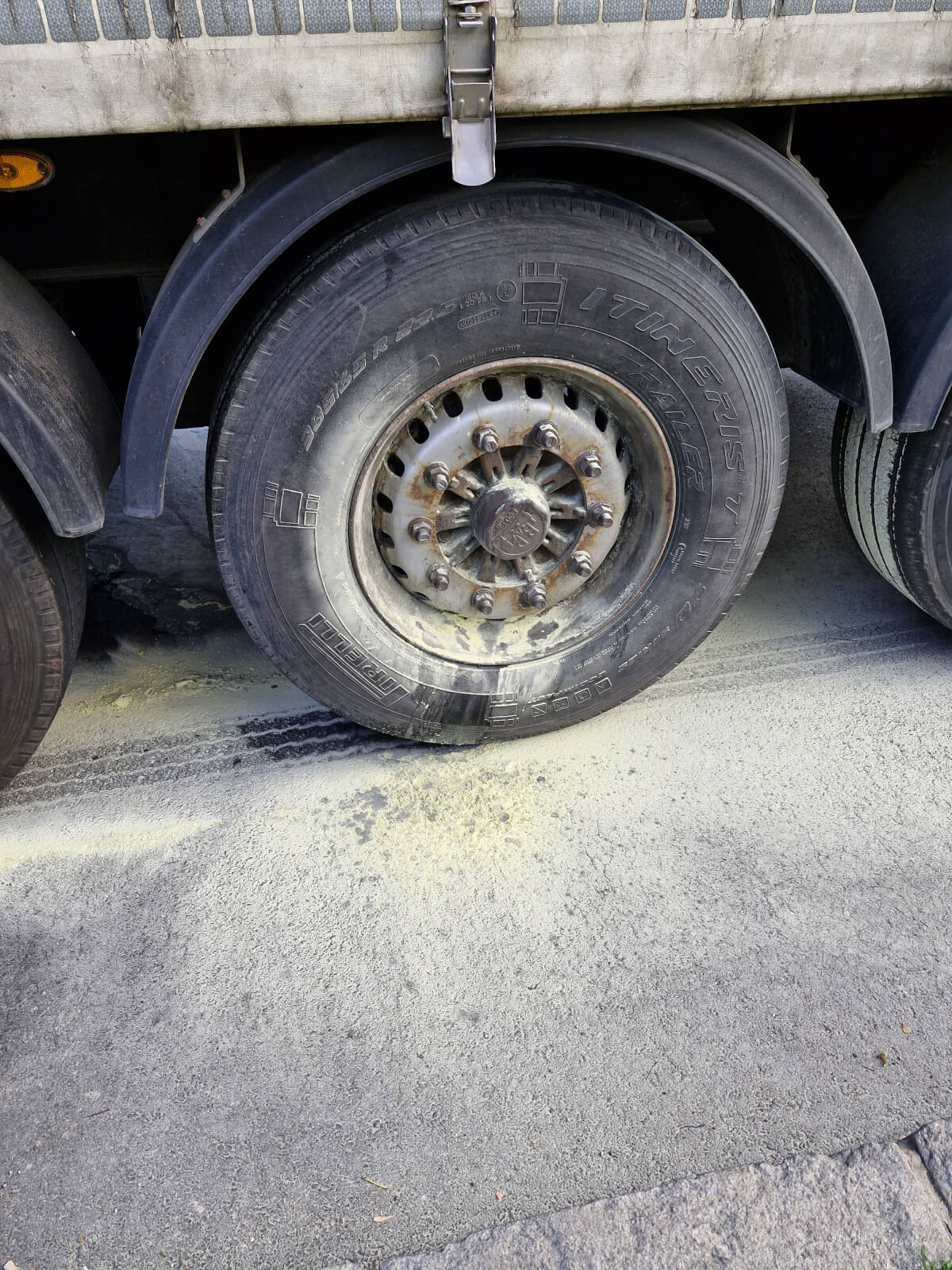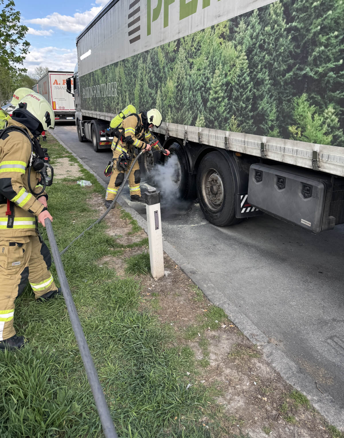 Ein Reifen auf der linken Seite des LKWs war bereits von der vor Ort befindlichen Polizeistreife mit einem Feuerlöscher abgelöscht worden.