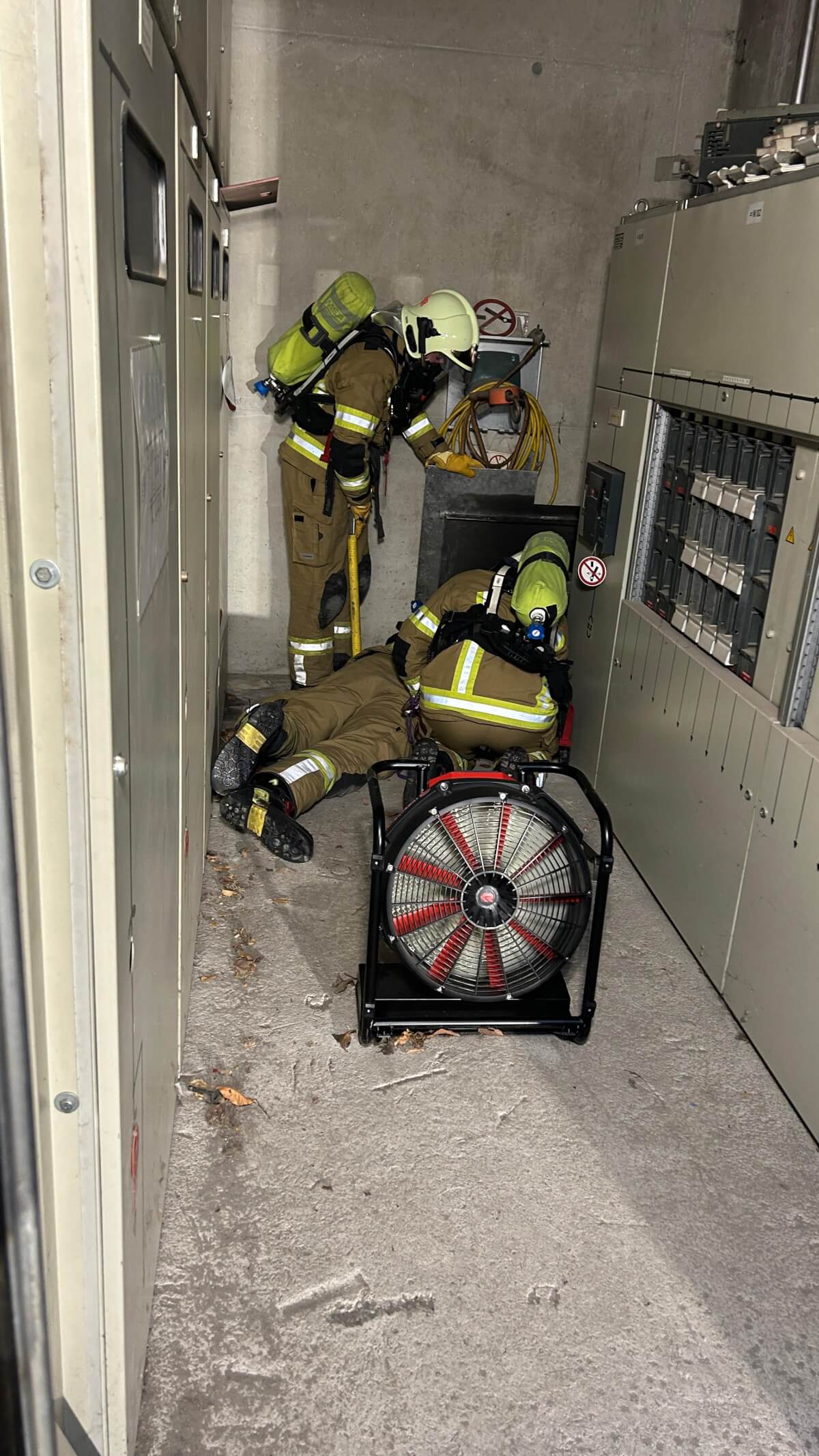 Unter Einsatz des Atemschutzes konnte der Brand schnell lokalisiert werden und mittels CO2-Löscher die Brandbekämpfung durchgeführt werden. Die weitere Kühlung erfolgte ebenso mittels Feuerlöscher.