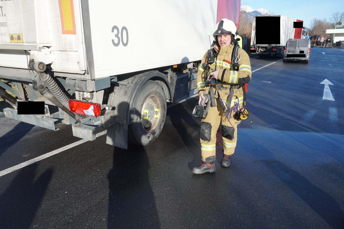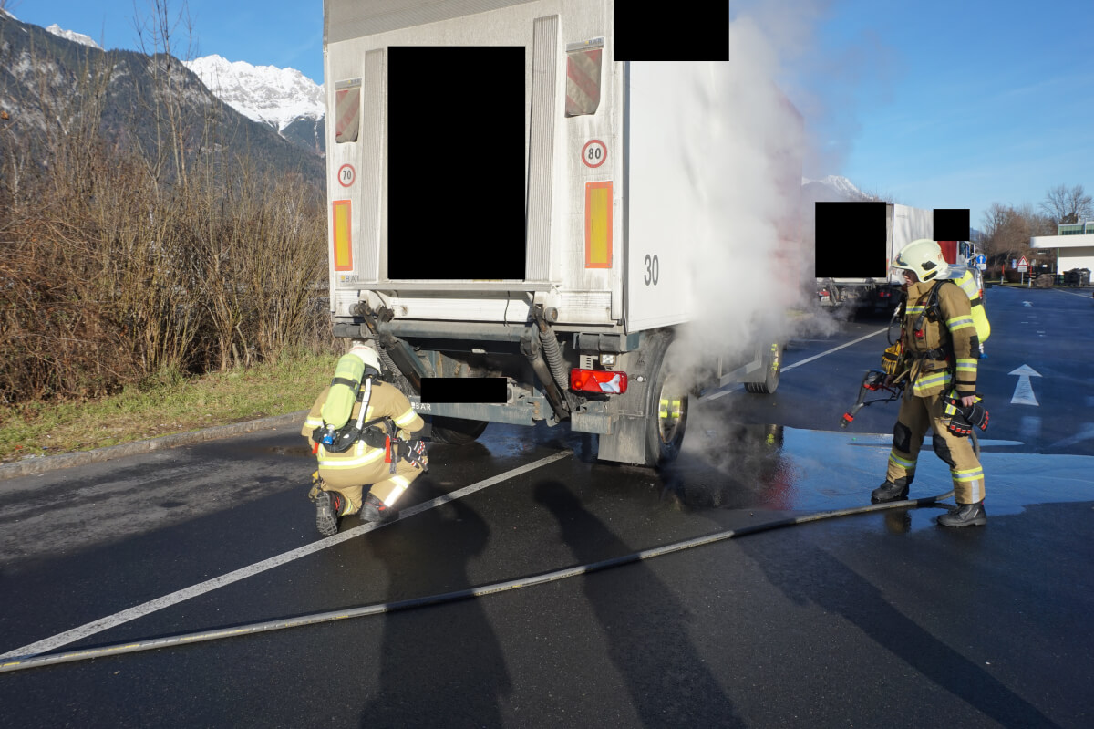 Aufgrund einer überhitzten Bremse, kam es bei der Hinterachse eines LKW-Anhängers zu einer Rauchentwicklung. Geistesgegenwärtig lenkte der Fahrer das Fahrzeuggespann, auf einen angrenzenden Parkplatz und hängte den Anhänger vom Zugfahrzeug ab. Erste Löschversuche durch den Fahrer und eines Passanten glückten und somit musste die Feuerwehr Völs, nur noch mittels Wärmebildkamera die Hinterachse auf Hitze kontrollieren und kühlte diese anschließend mit einem HD-Rohr. Nach circa 15 Minuten war der Einsatz für die Feuerwehr Völs beendet.
