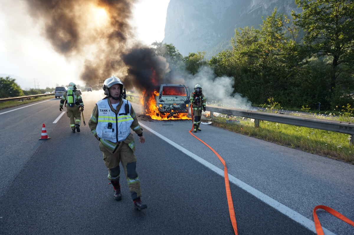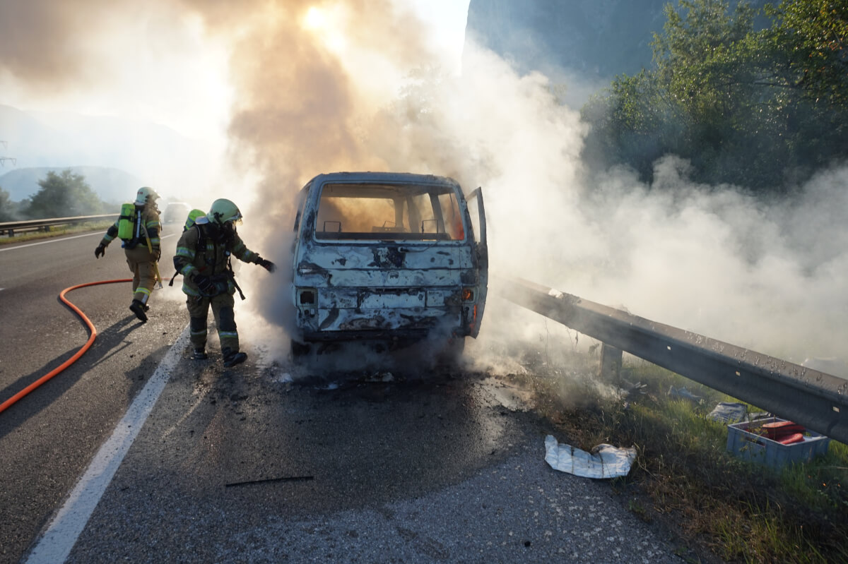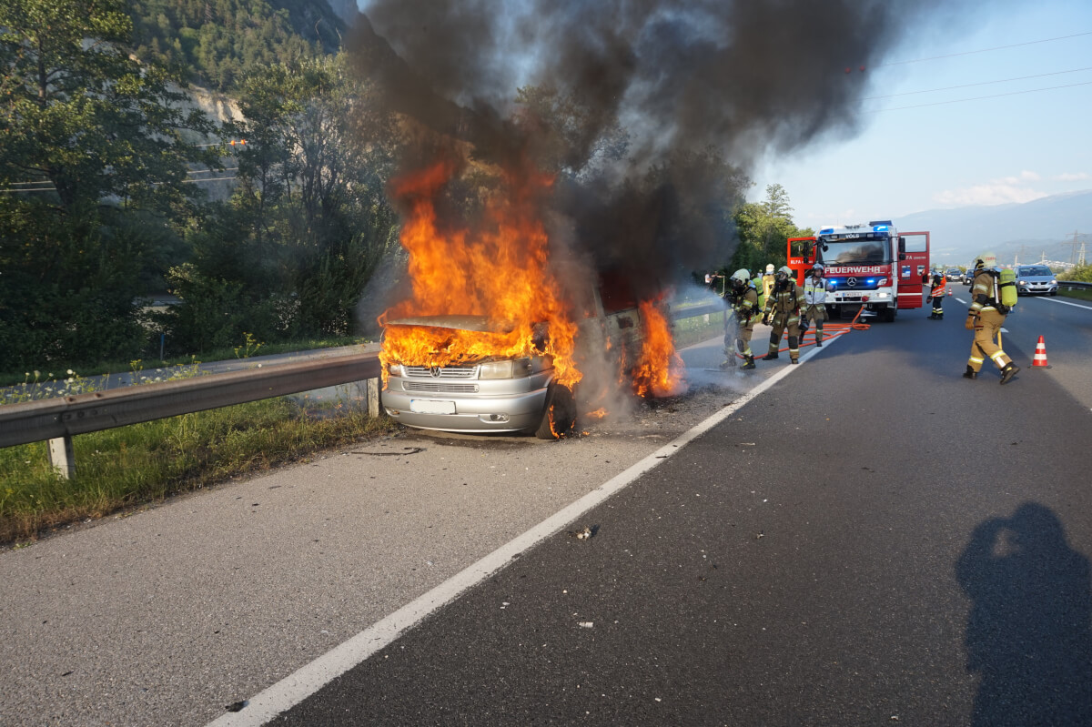 Sonntagabend wurde die Feuerwehr Völs zu einem Fahrzeugbrand auf die A12 Inntalautobahn alarmiert. Bereits auf Anfahrt zum Einsatzort konnte eine starke Rauchentwicklung auf der Autobahn gesichtet werden, welche in weiterer Folge durch einen in Vollbrand stehenden VW Bus bestätigt wurde.