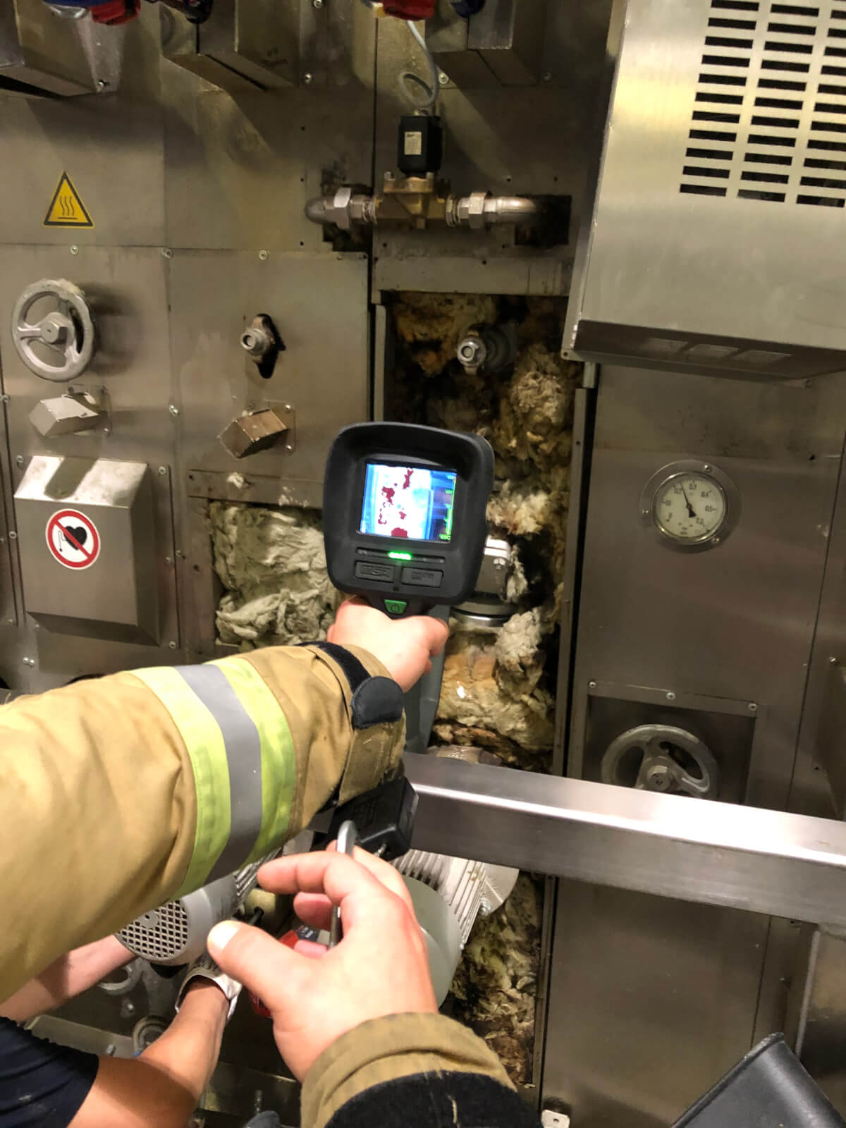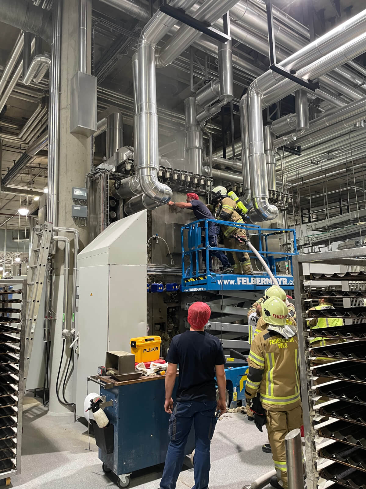 Im Rahmen des Brandmeldealarmes beim Altersheim wurde die Feuerwehr Völs telefonisch verständigt, dass es im Bereich eines Produktionsbetriebes in Völs aufgrund von Schweißarbeiten zu einer Glimmbrandentwicklung gekommen ist. Somit handelte es sich um einen Folgeeinsatz ohne Zusatzalarmierung. Bei Eintreffen des Einsatzleiters konnte nach Erkundung mit den Technikern vor Ort festgestellt werden, dass es bei einem Thermoölofen hinter diversen Verkleidungen zu einer Glimmbrandentwicklung gekommen ist. Die Aufgabe der Feuerwehr bestand darin, in Zusammenarbeit mit den Technikern die Verkleidungen zu demontieren und die glimmende Dämmwolle zu entfernen. Diese Arbeiten wurden von der Feuerwehr Völs mittels schweren Atemschutz unter Anwendung von Schanzwerkzeug und des Speziallöschmittels F500 durchgeführt. Nach Kontrolle mit der Wärmebildkamera und Durchnässung des restlichen Dämmmaterials konnte der Einsatz für die Feuerwehr Völs beendet werden und dem Betreiber unter Anweisung des Erfordernisses einer Brandsicherheitswache und laufenden Kontrolle übergeben werden.