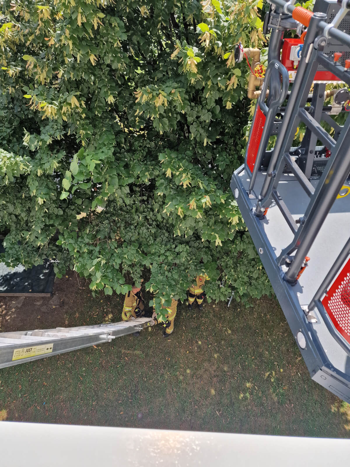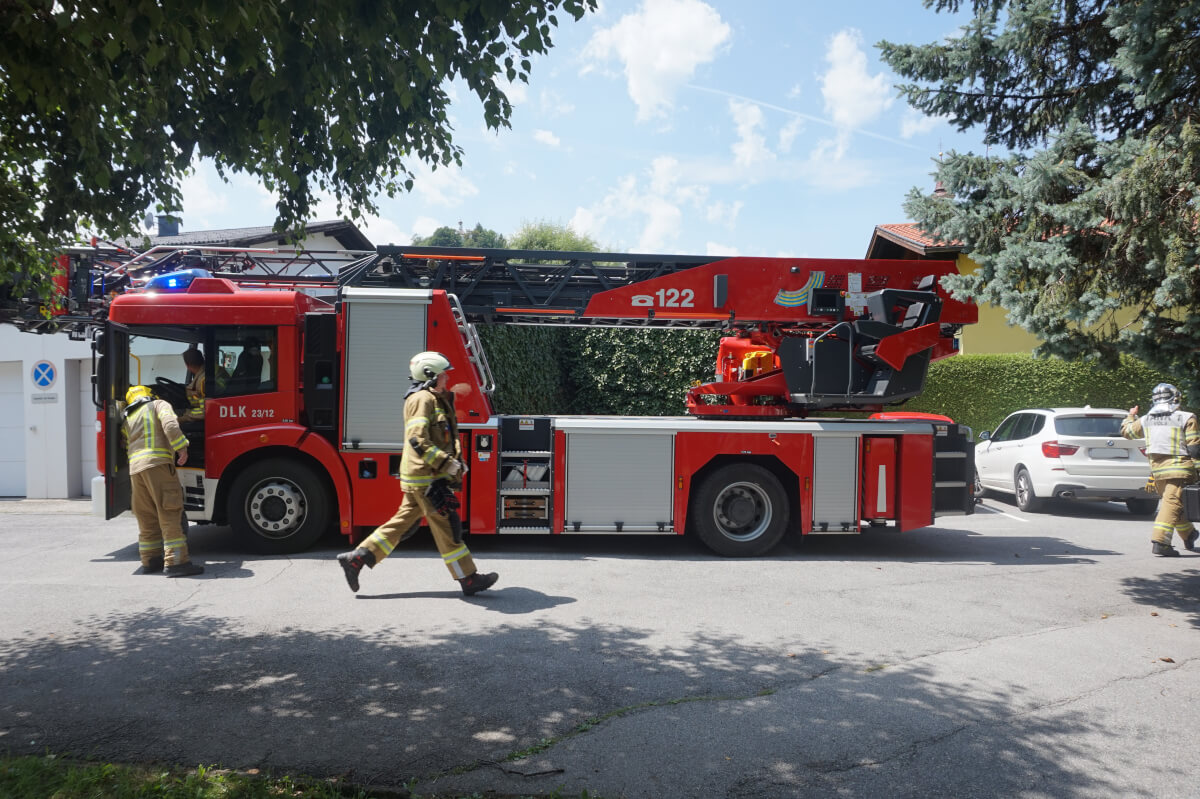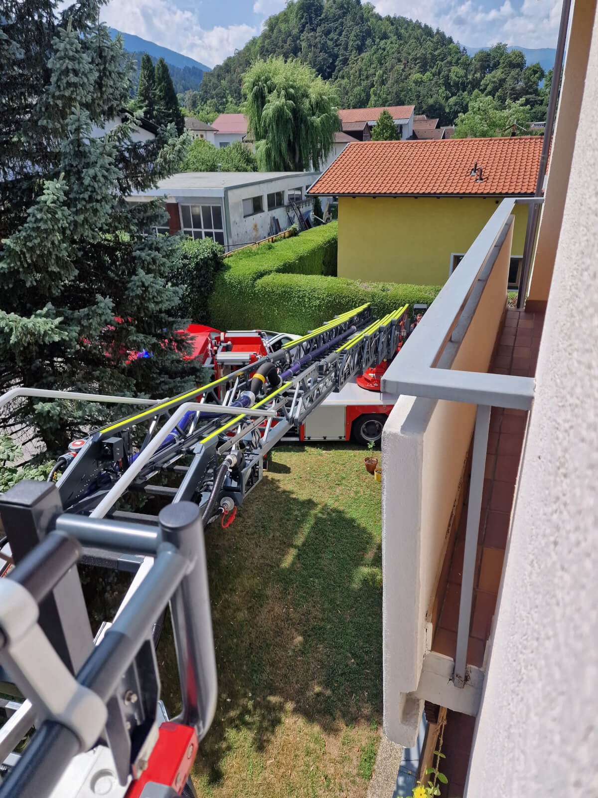 Zugleich wurde die Drehleiter in Stellung gebracht, um eine mögliche anschließende schonende Bergung des Patienten aus dem zweiten Stock zu ermöglichen. Trotz der sehr engen Platzverhältnisse aufgrund der parkenden Fahrzeuge und der Bäume konnte die neue Drehleiter problemlos aufgestellt werden. Die Wohnung wurde schlussendlich durch das Fenster mittels der Schiebeleiter betreten und die Wohnungstüre von innen geöffnet, um den Rettungsdienst den Zugang in die Wohnung zu verschaffen.