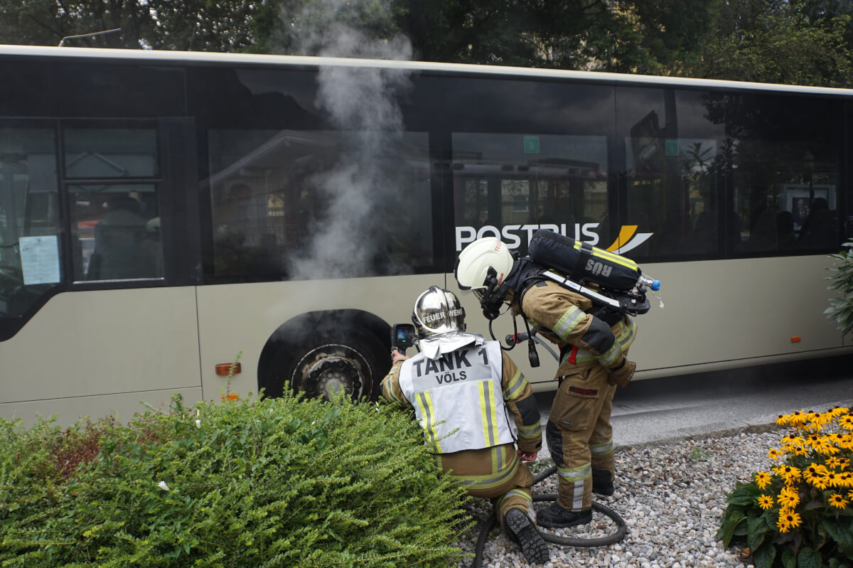 Dienstag Abend wurde die Feuerwehr Völs zu einem Brandgeschehen auf die Haltestelle West alarmiert. Durch einen technischen Defekt überhitze die Bremse eines Buses. Der Busfahrer konnte die ersten Flammen im Radkasten bereits mit einem Pulverlöscher ablöschen. Mittels Wärmebildkamera wurde der Gesamte Radkasten sowie der Fahrgastraum auf Hitzequellen abgesucht und diese mittels HD abgelöscht bzw. abgekühlt.