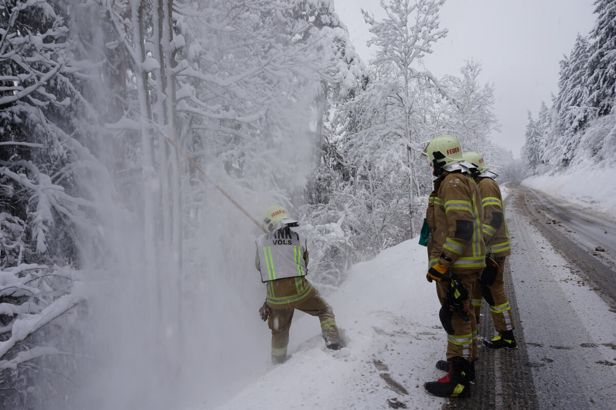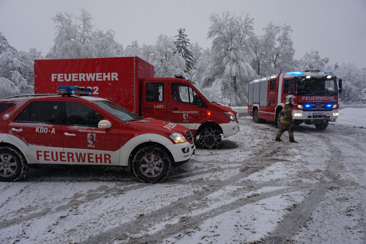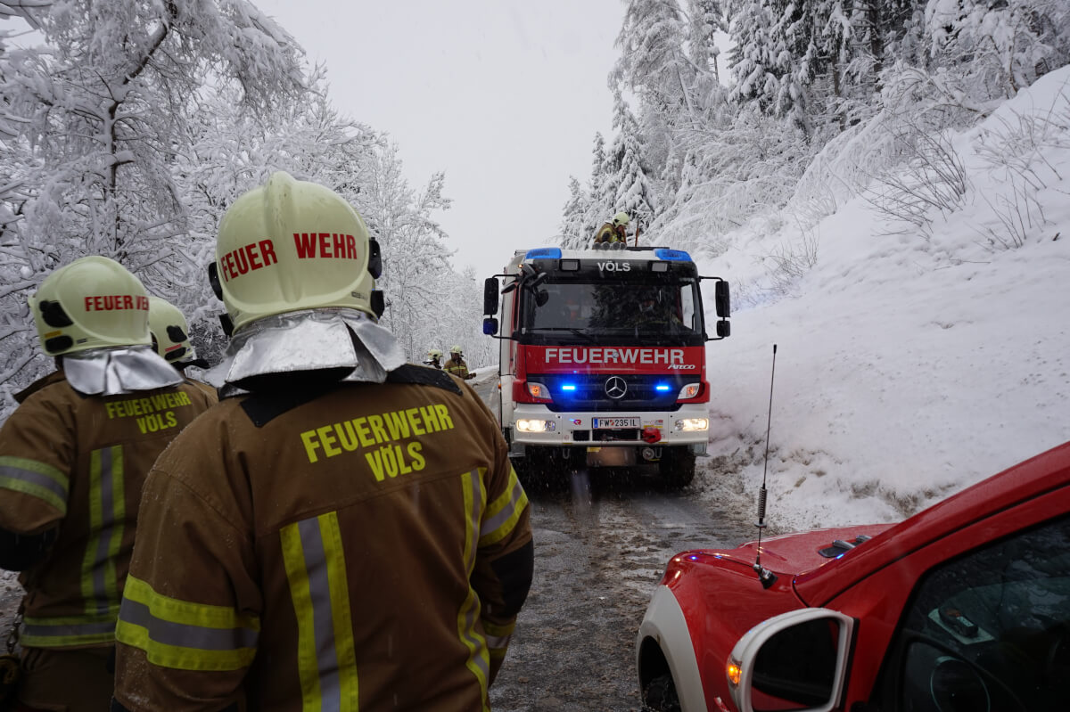 Am Sonntag Nachmittag wurde die Feuerwehr Völs gemeinsam mit der Feuerwehr Götzens zu einem technischen Einsatz auf der Götzner Straße alarmiert. Mehrere Bäume hingen durch die Schneelast in die Straße und gefährdeten somit den Verkehr. Eine Straßensperre wurde errichtet und mittels Einreishacken, Vorschlaghammer sowie Motorsäge die Bäume vom Schnee befreit. Zusätzlich wurde mit dem Hochdruck von zwei Tanklöschfahrzeugen der Schnee von den Bäumen gespritzt. Nach dem ein Schneepflug den restlich Schnee von der Straße entfernte, konnte die Sperre aufgehoben werden und die Feuerwehr Völs um 17:50 Uhr wieder einrücken.