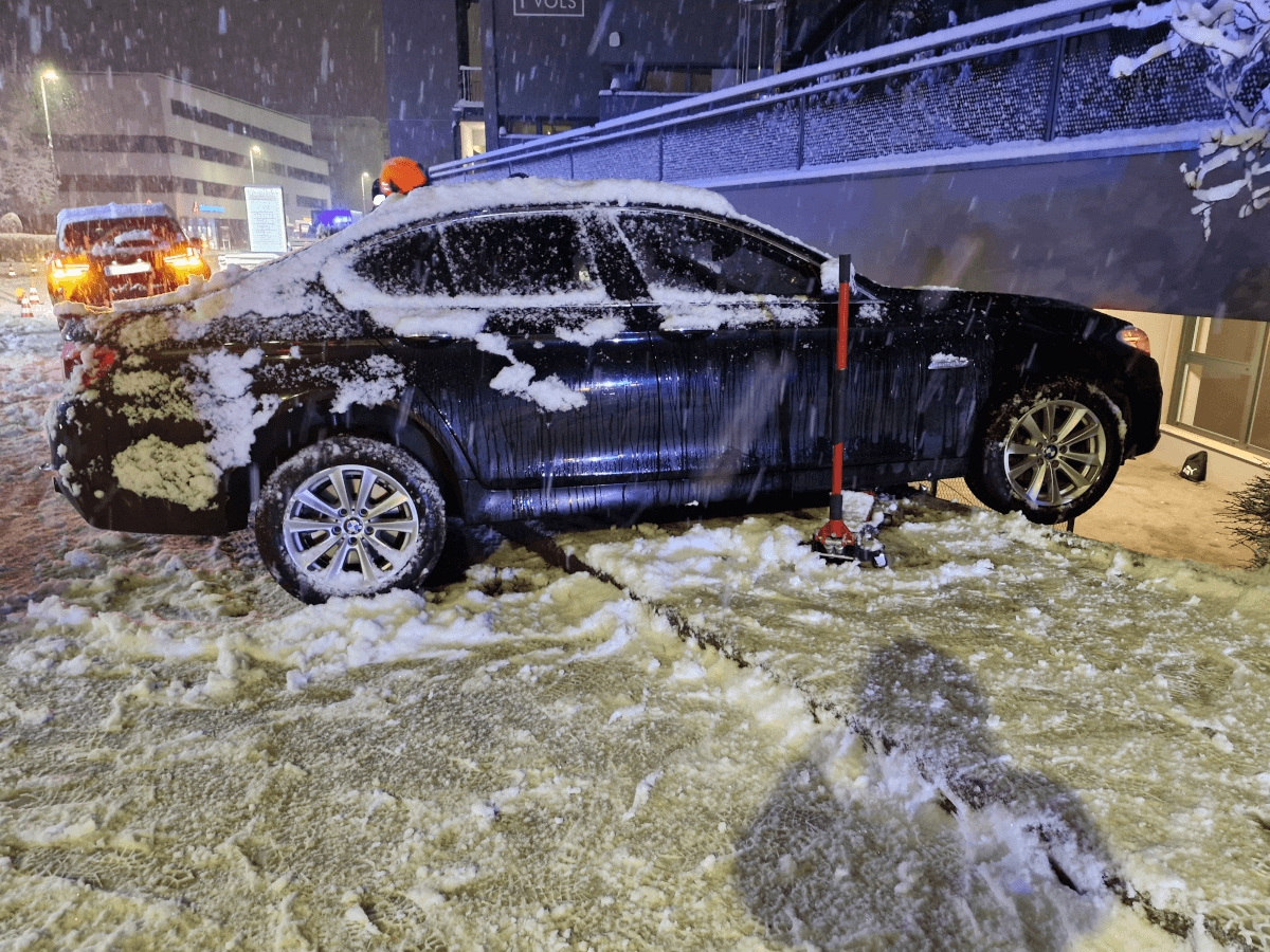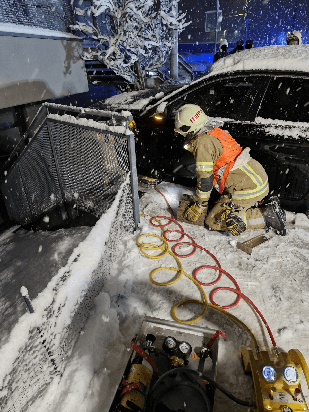 Da aufgrund der starken Schneefälle der Abschleppdienst nicht verfügbar war, wurde das Fahrzeug von uns gesichert und vorsichtig wieder auf die Straße gezogen.