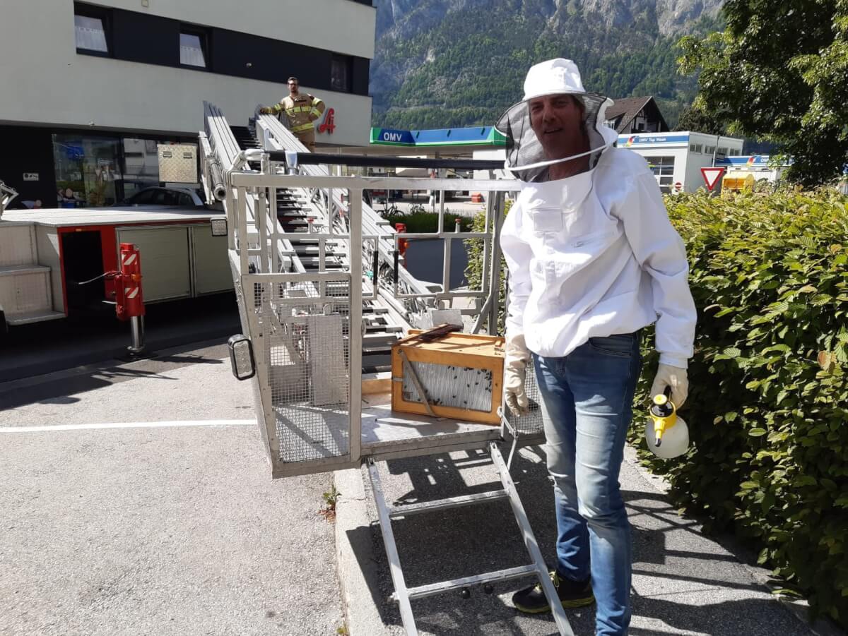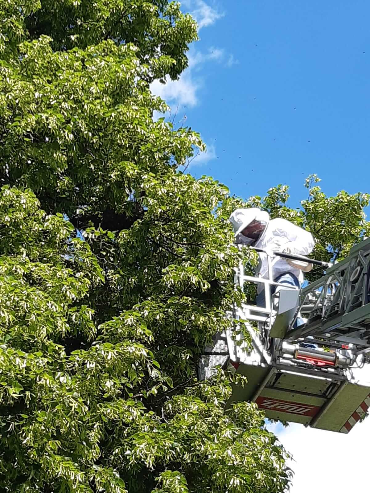Am Donnerstagnachmittag haben wir einen Imker mit der Drehleiter unterstützt. Ein Bienenschwarm hat sich in der Albertistraße auf einem Baum niedergelassen und musste vom Imker eingefangen werden. Bienen sind sehr wichtige Tiere, daher wurde der Imker von uns unterstützt. Das entfernen von Wespennester wird jedoch von Fachfirmen durchgeführt