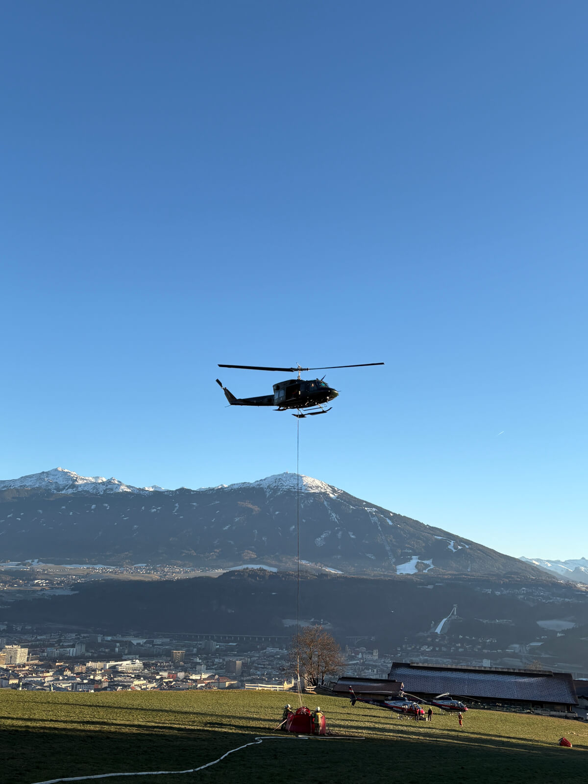 Wir unterstützen vor Ort bereits seit vier Tagen mit unserem TLFA 3000/200 im Pendelverkehr, um die Wasserversorgung für den Einsatz der Hubschrauber sicherzustellen.