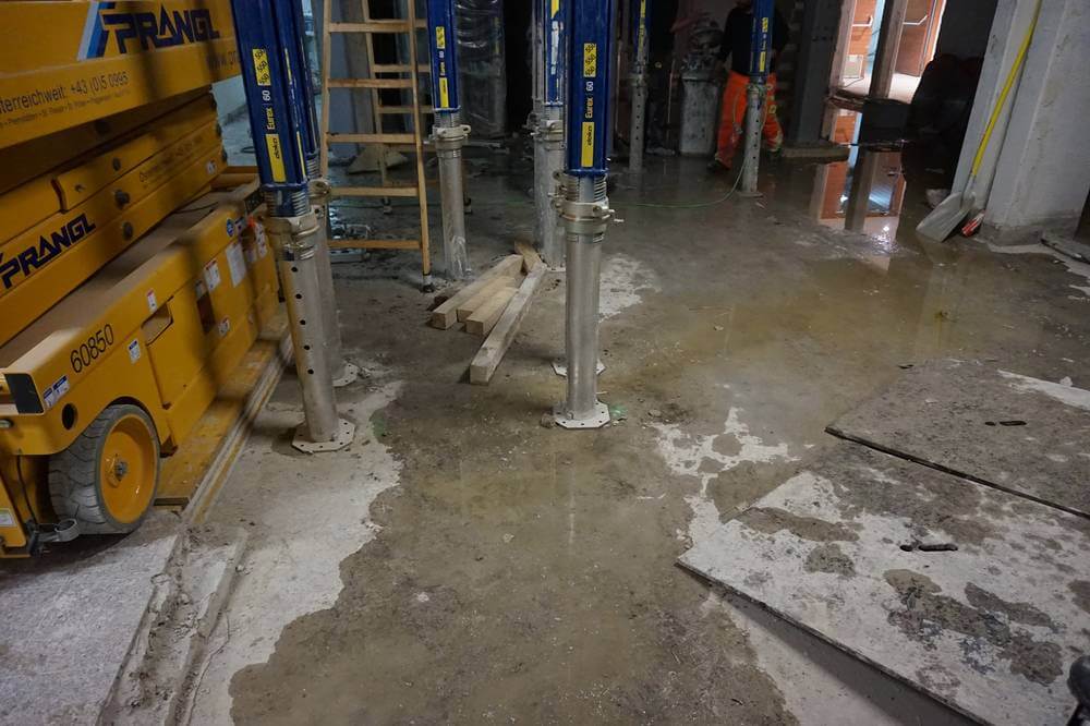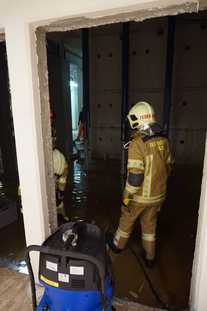 Im Baustellenbereich wurde mit einem Stappler ein Sprinkler angefahren, dieser verursachte einen Wasserschaden. Mit Wassersaugern könnte die Halle getrocknet werden und die Feuerwehr Völs wieder einrücken.