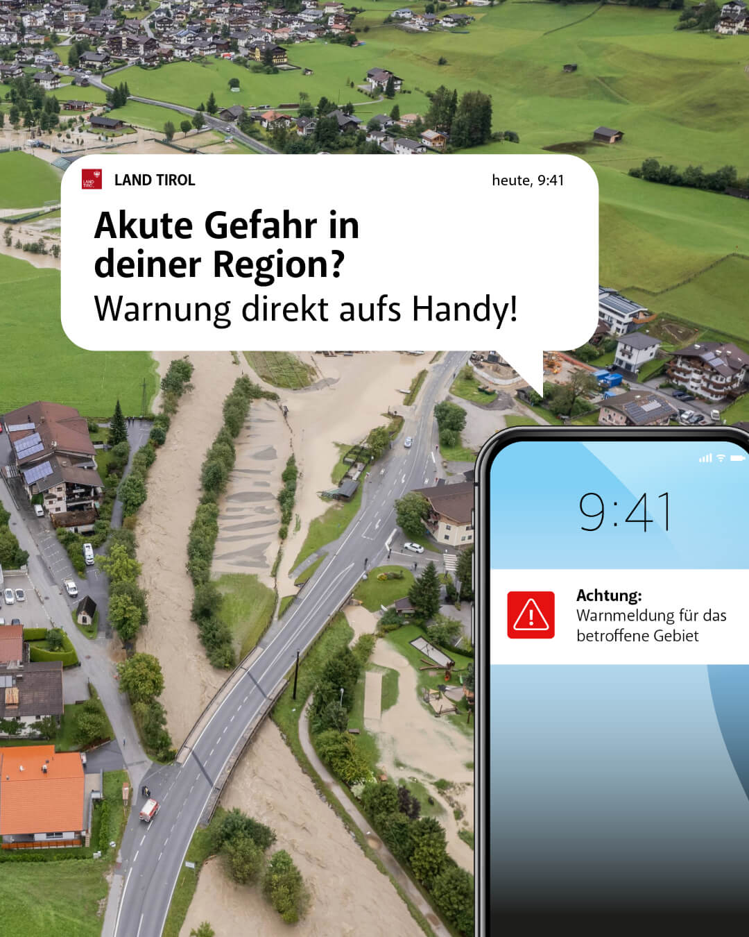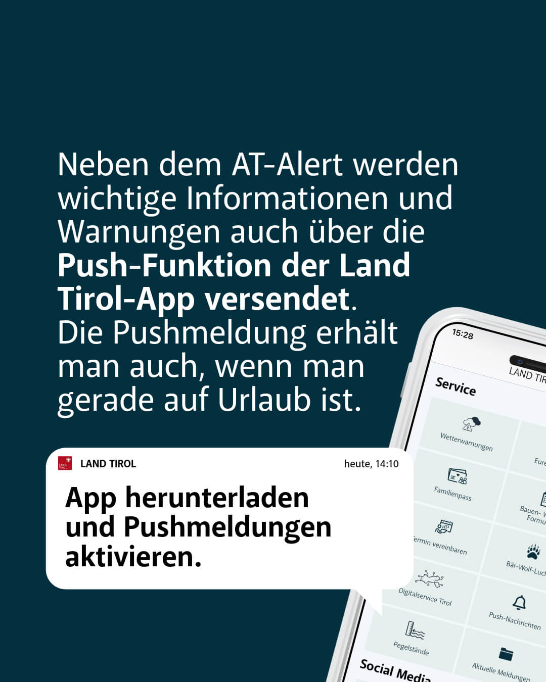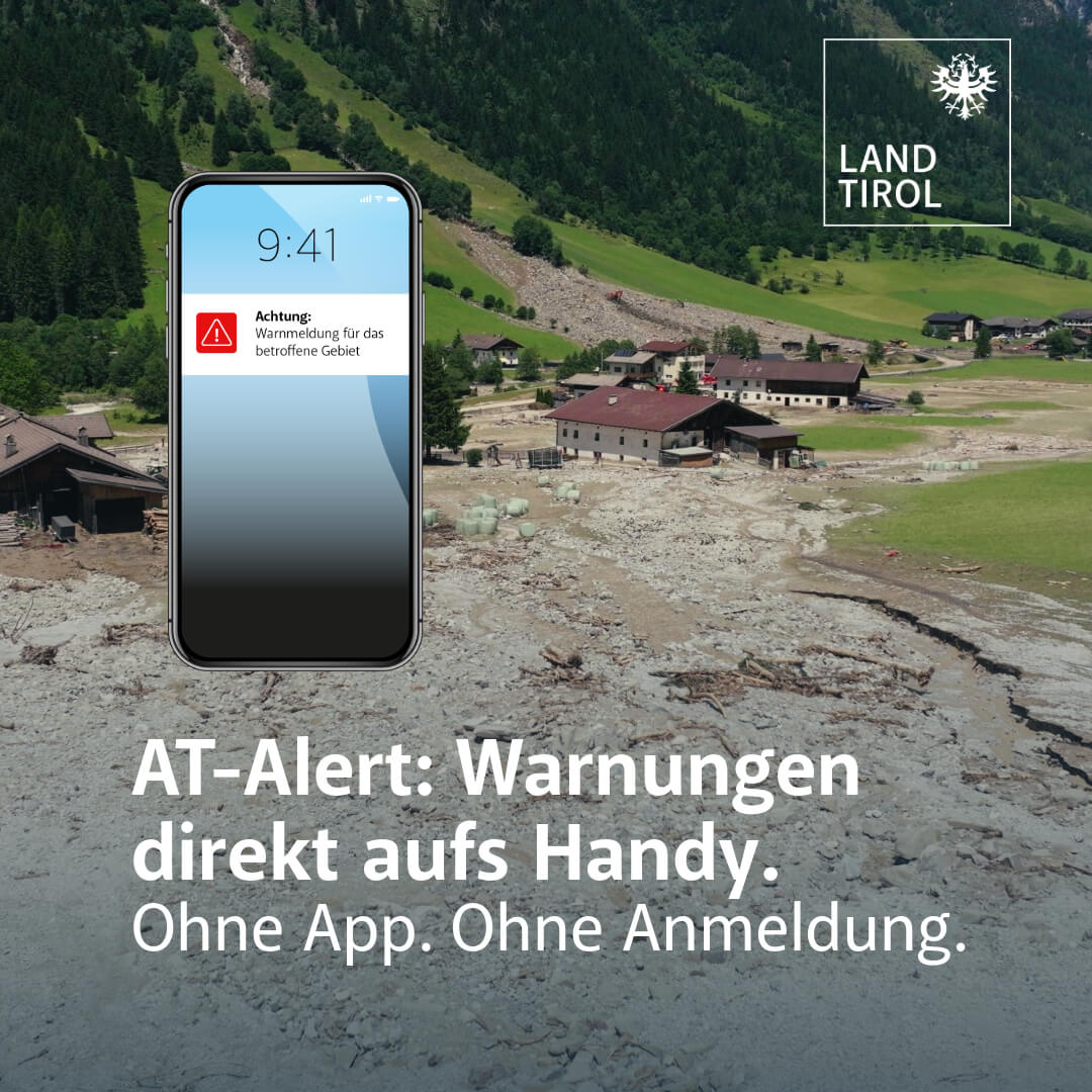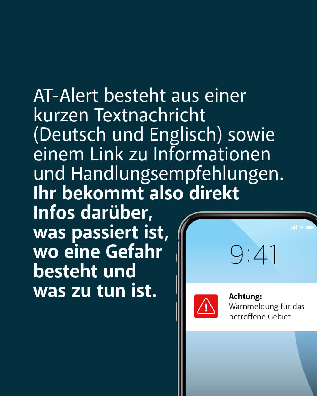 Seit Herbst 2024 gibt es mit AT-Alert ein österreichweites Bevölkerungswarnsystem, das dich bei Gefahrensituationen wie Unwettern, Unfällen oder polizeilichen Lagen direkt und ohne App auf deinem Handy informiert!