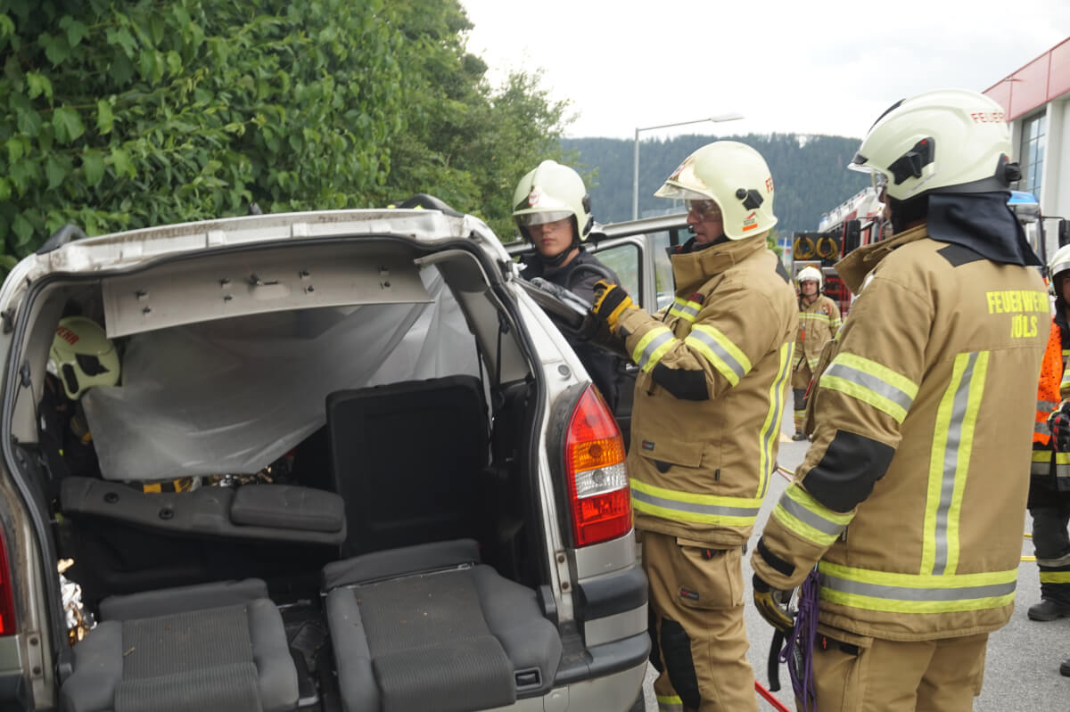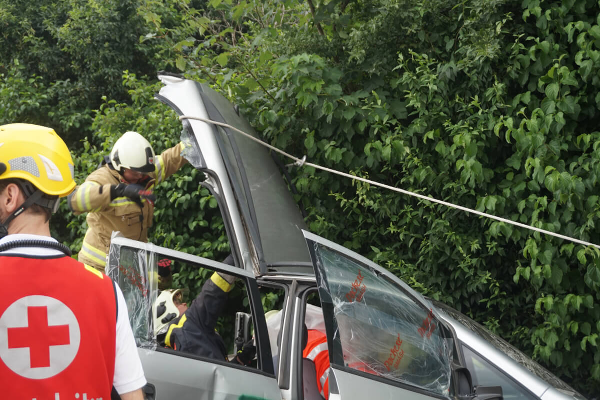 Direkt im Anschluss ging es zu einem abgestürzten Fahrzeug. Die Aufgabe der Feuerwehr bestand hier darin, das verunfallte Fahrzeug zu sichern, um ein weiteres Abstürzen zu verhindern und die verletzten Personen gemeinsam mit dem Rettungsdienst unter Anleitung des sich vor Ort befindlichen Notarzt zu befreien.