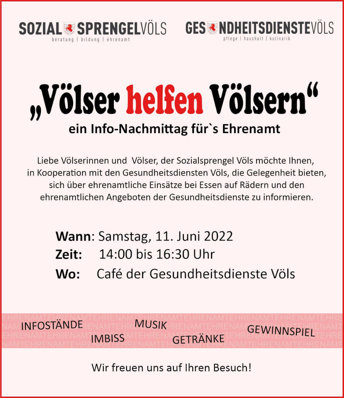Liebe Völserinnen und Völser, der Sozialsprengel Völs möchte Ihnen, in Kooperation mit den Gesundheitsdiensten Völs, die Gelegenheit bieten, sich über ehrenamtliche Einsätze bei Essen auf Rädern und den ehrenamtlichen Angeboten der Gesundheitsdienste zu informieren.