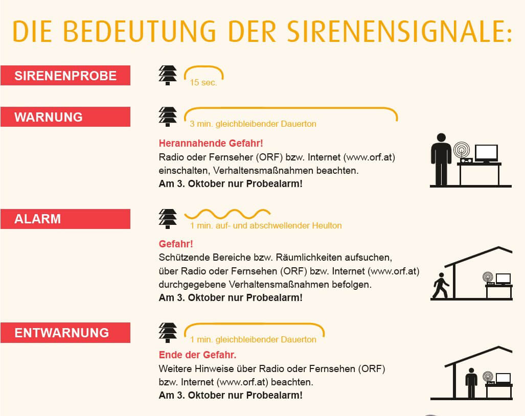 Mit mehr als 8.000 Sirenen sowie über KATWARN Österreich/Austria kann die Bevölkerung im Katastrophenfall gewarnt und alarmiert werden. Um Sie mit diesen Signalen vertraut zu machen und gleichzeitig die Funktion und Reichweite der Sirenen zu testen, wird einmal jährlich von der Bundeswarnzentrale im Bundesministerium für Inneres mit den Ämtern der Landesregierungen ein österreichweiter Zivilschutz-Probealarm durchgeführt.